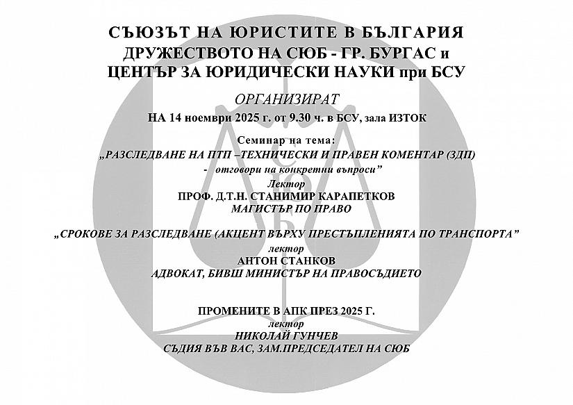 14.11.2025 г. семинар на тема "Разследване на ПТП - технически и правен коментар (ЗДП) - отговори на конкретни въпроси", организиран от СЮБ